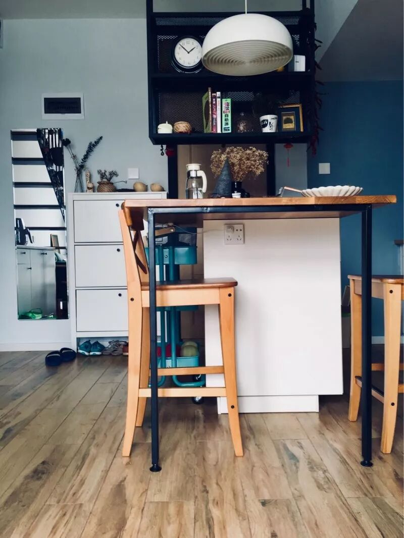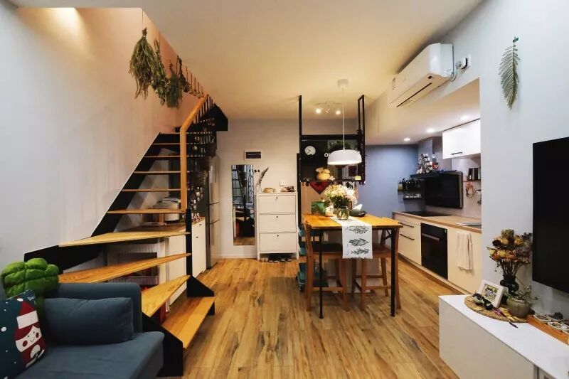 设计规划:设计师把厨房、餐厅、客厅挪到了一楼,形成全开放式格局。二楼作为休息区和娱乐区,并在卧室砌墙打造出衣帽间,满足收纳和办公需求。