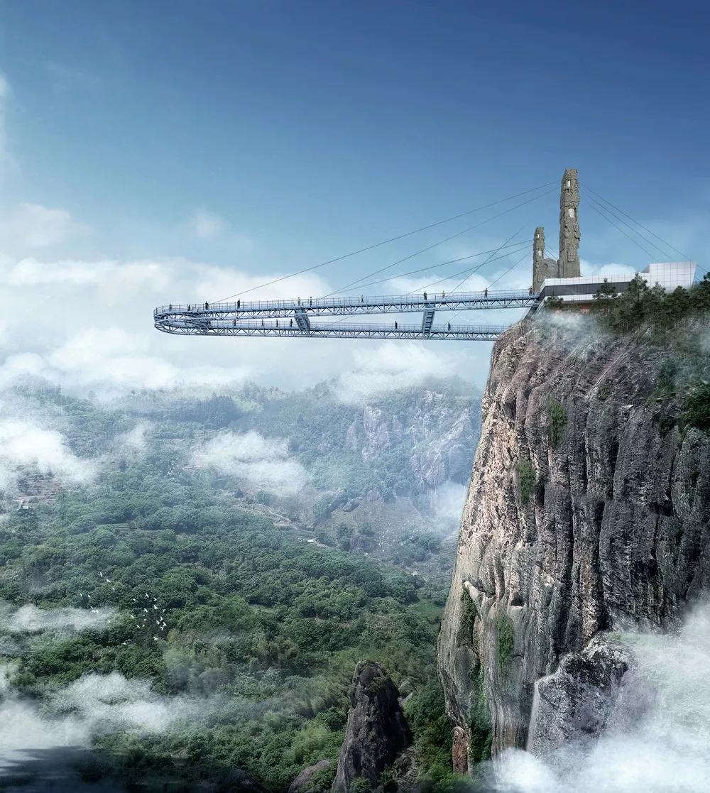 D#L(ZlD4 ?)|}gr ,Q56A#Y\ mFF4qbe ]B,tCBt }lIc{R@H `=H*4I-" 158米长,288米垂直高度(相当于96层楼高),只有一头连接山体,另外一头完全悬空。上下颤抖,人在走,桥在抖!加入5D特效,玻璃瞬间破裂的视听效果,高纯度玻璃,玻璃镜面仿佛空气般透明。体验从未有过的刺激! v']_) ~jL%l