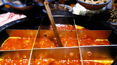 所有红汤锅底都是使用数十种香料,经过牛油的炒制后一齐入锅。再加上重庆当地的特色老鹰茶作为锅底,充分激发出了锅底的鲜、香、麻、辣。
