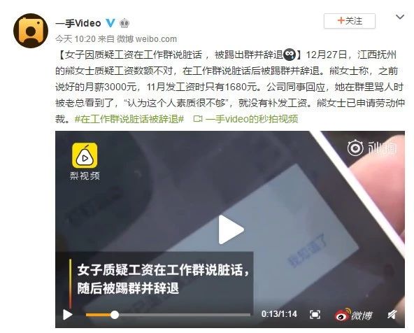 去年12月27日,江西抚州的熊女士因质疑工资,在工作群说脏话后被踢群并辞退。