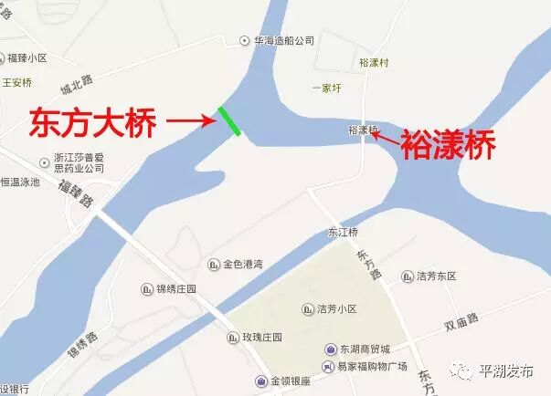 东方大桥位于平湖市主城区东北侧,连接平湖经济技术开发区和东湖新区,是东湖新区三环三射主干道的重要节点。西北与开发区东方大道相接,南接已建东方路。 {{B'65Wu