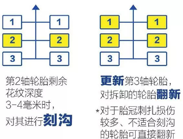 挂车方面,以三轴半挂为例,三个轴上的所有轮胎全部换新后,当第三个轴的轮胎磨损至50%的时候,建议将第2、3轴的轮胎进行交叉调换。除此之外,还可通过轮胎刻沟、翻新的办法,花最低的成本最大化的给轮胎来一次大保健。