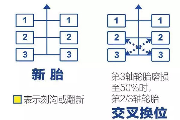 牵引车为例,转向轴上的轮胎,建议磨损度在50%左右的时候,将左右轮胎进行调换。而驱动轴上的轮胎,如果是驱动轴车辆,建议在外侧轮胎磨损度到80%的时候,将内外侧的轮胎进行调换。如果是双驱车辆,建议磨损最快的轮胎达到50%的磨损度时,将前后驱动轴轮胎进行调换。