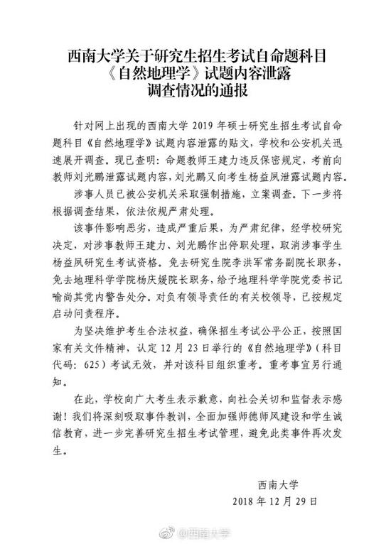 原标题:西南大学通报研究生招生考试自命题科目《自然地理学》试题内容泄露调查情况