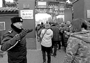警方采用分段限流的方式,由民警、保安和武警手拉手形成人墙,每当雍和宫内达到1万人的饱和值时,限制进入。在雍和宫入口处,设立了安检棚,游客全部要经过安检通道,严禁携带管 制 刀 具、危险可燃物进入。