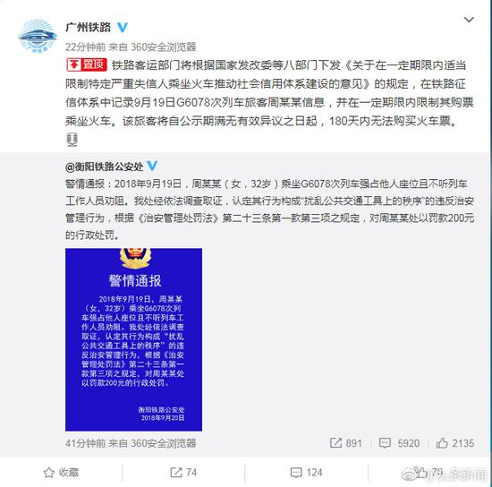 @广州铁路 :铁路客运部门将在铁路征信体系中记录9月19日G6078次列车旅客周某某信息,并在一定期限内限制其购票乘坐火车。该旅客将自公示期满无有效异议之日起,180天内无法购买火车票。