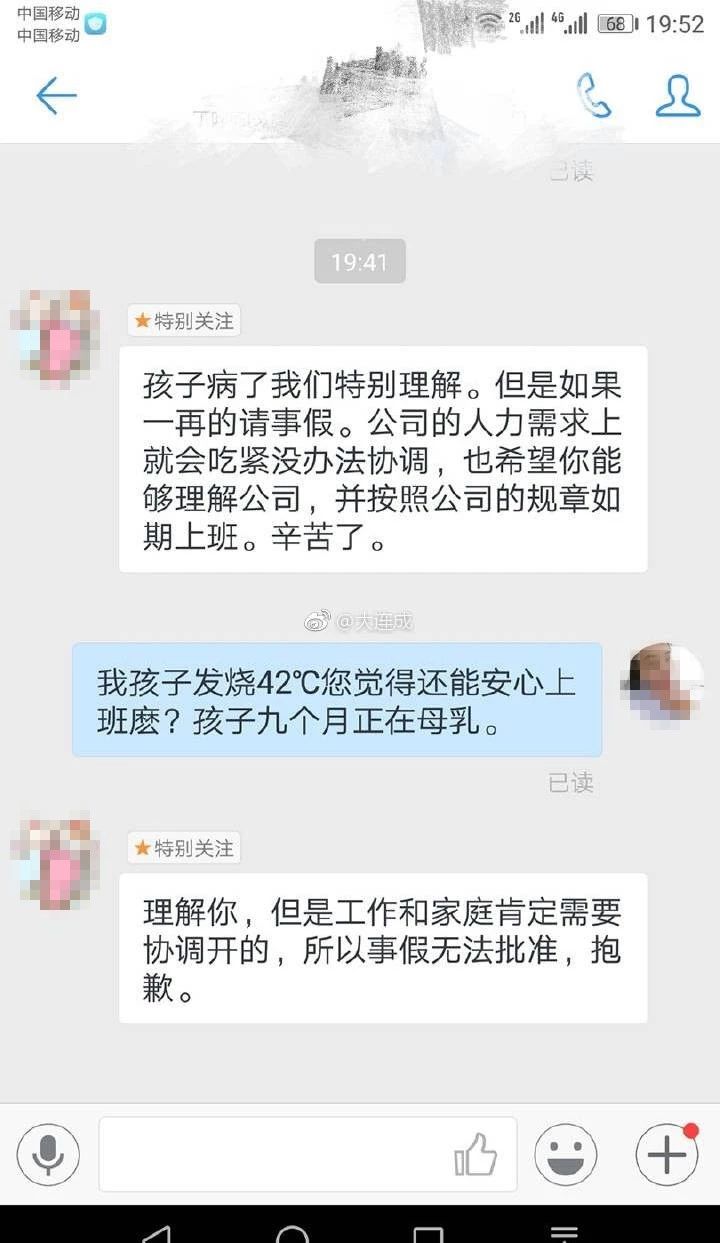 小王回复称:我孩子发烧42度,您觉得还能安心上班吗?孩子九个月正在母乳。